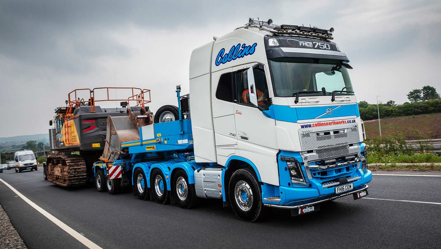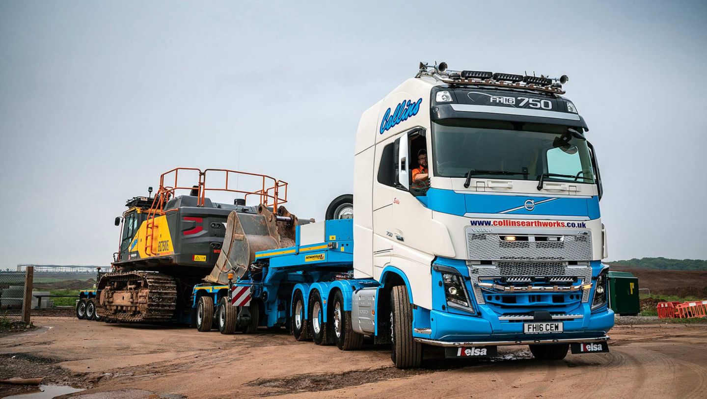 Supplied by Kevan Morris, Truck Sales Executive at Hartshorne Motor Services Ltd, the prime mover was ordered immediately after the performance of a similarly specified Volvo demonstrator. "We were gifted, or should I say wrangled, the demonstration vehicle for a day, then two months later we used it for a full fortnight. That really sold the big Volvo to us and this newcomer won't be the last FH16-750 8x4 tractor unit we have," enthuses Matt Smith, Low Loader Manager at Collins Earthworks.