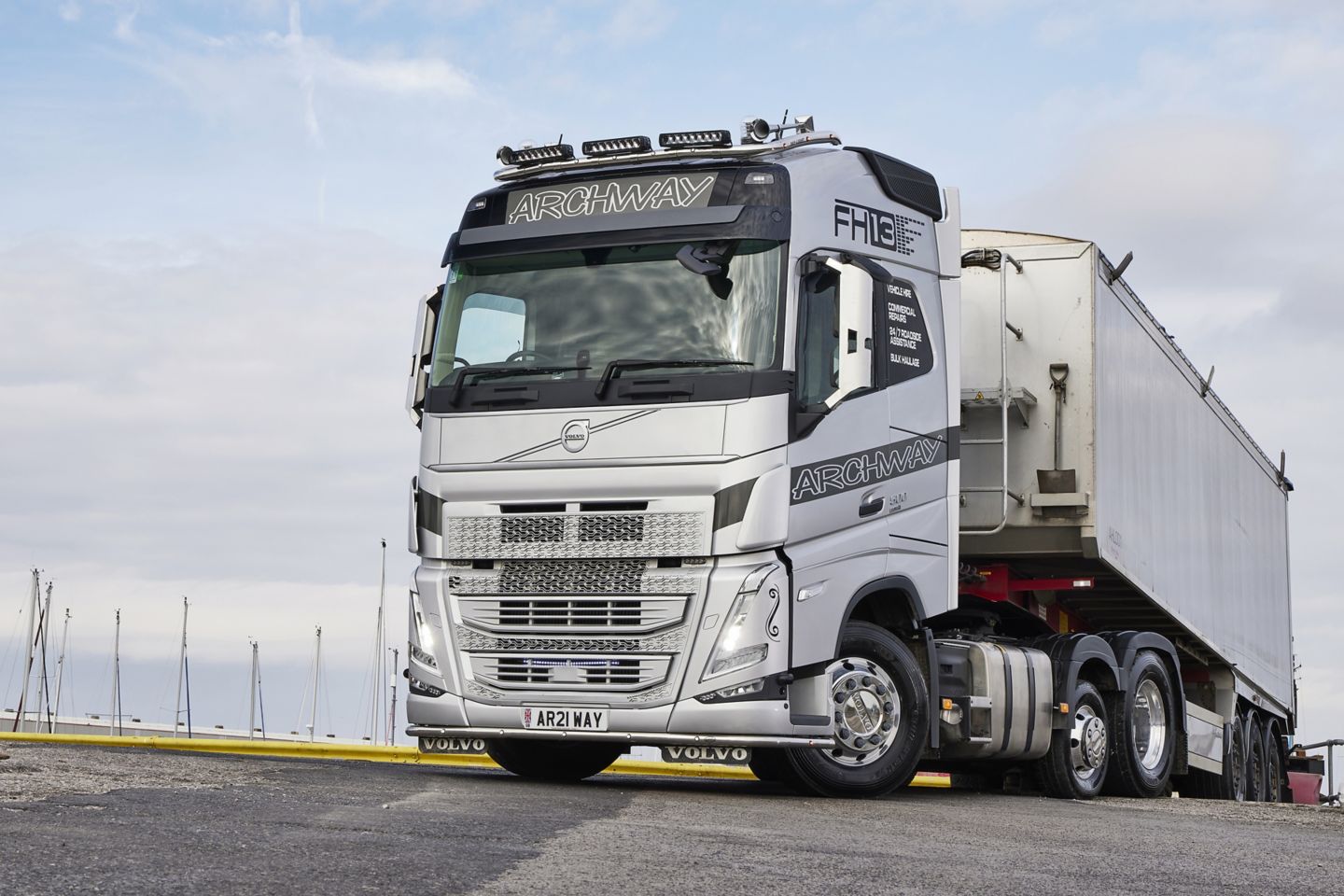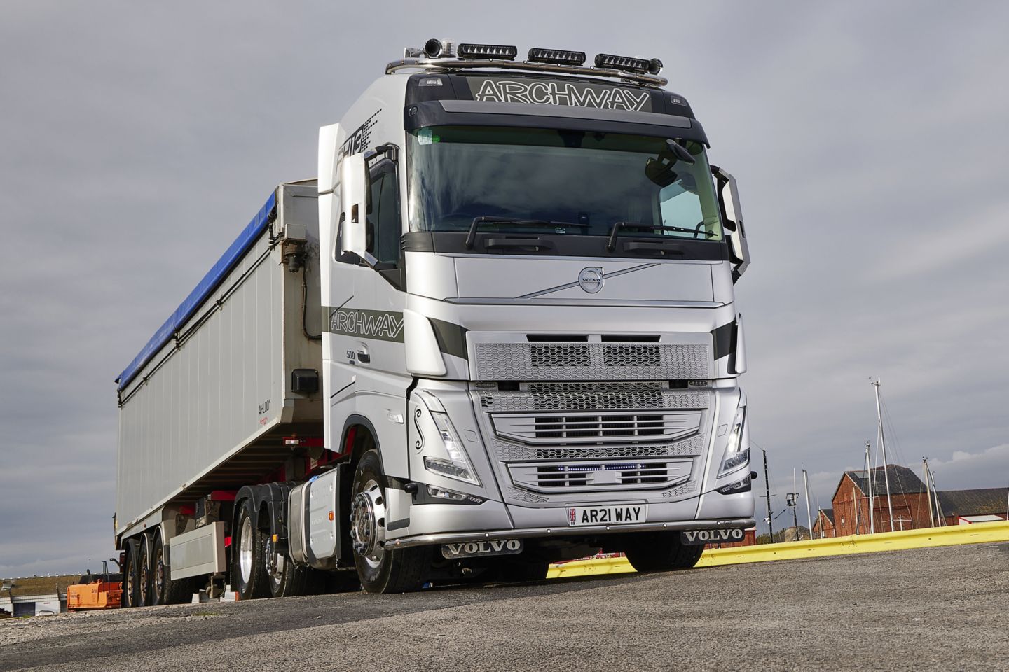 The first new vehicle will operate with a Fruehauf bulk tipping trailer and be used to deliver aggregates nationwide, covering up to 120,000 km a year. It benefits from a full DVS system, tipping gear, light bars, beacons and a colour coordinated front grille – fitted in-house by the Archway team.